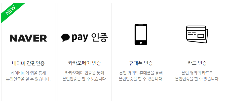 4. 네이버 간편인증, 카카오페이 인증, 휴대폰 인증, 카드 인증 중 하나를 선택해 본인임을 인증합니다.