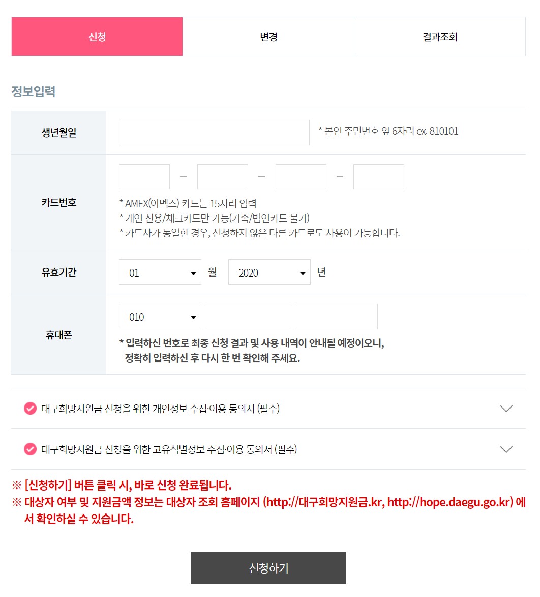 신용/체크카드로 대구희망지원금을 받으시려면 해당 카드사의 홈페이지에서 신청하시면 됩니다. 온라인 신청 기간은 9월 25일 23시까지입니다. 신청 방법은 1차 재난지원금 받으실 때 신용/체크카드를 이용하셨다면 절차가 동일하므로 쉽게 하실 수 있습니다.