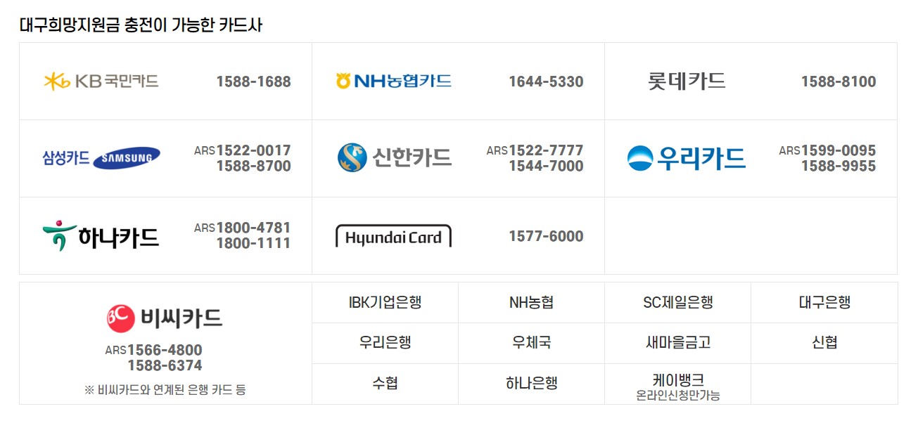 대구희망지원금 지급 가능한 신용/체크카드는 아래표를 참고하세요.