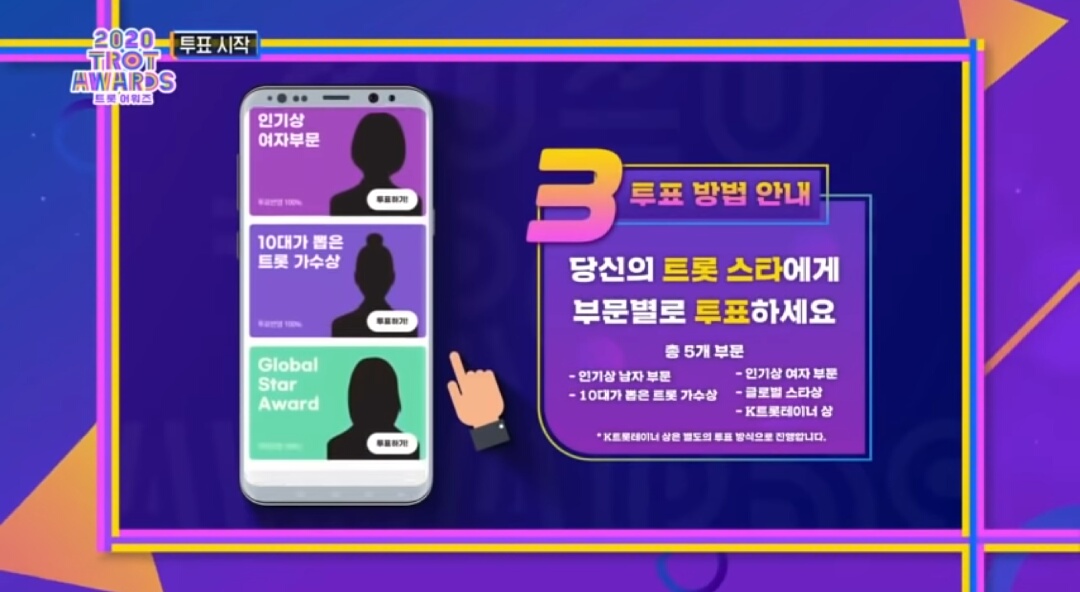 5. 투표는 '인기상 남자 부문, 인기상 여자 부문, 10대가 뽑은 트롯 가수상(10대만 참여 가능), 글로벌 스타상(해외 거주 팬들만 참여 가능), K트롯테이너상' 이상 총 5개 부문으로 이뤄져 있으며, K트롯테이너상은 별도의 링크를 따라 투표해주세요.