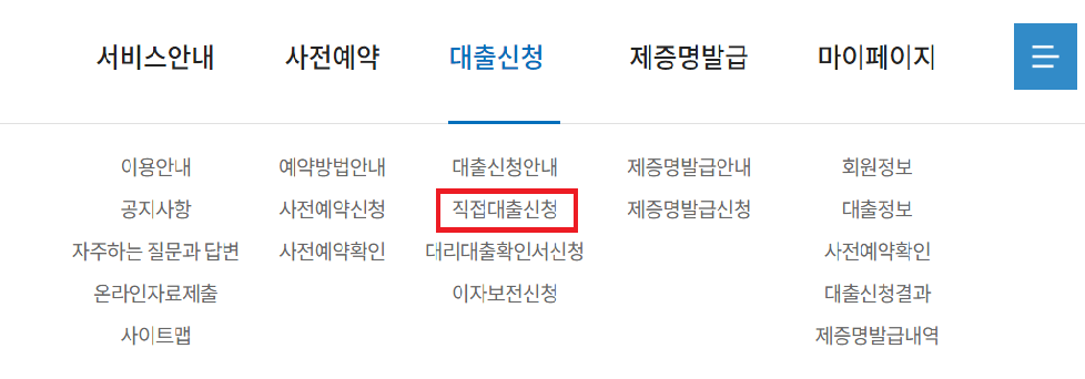 2. 상단의 항목 중 "대출신청 --> 직접대출신청"을 클릭합니다.
