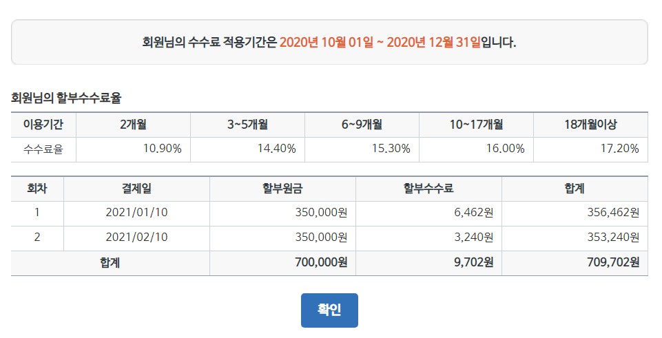 따라서 신용카드 할부 이용 시 할부 개월 수는 되록이면 2개월로 하고, 카드 승인일자(사용일자)는 카드 이용기간 시작점이 아닌 끝점과 가깝게 할수록 할부 수수료를 절감할 수 있겠습니다.