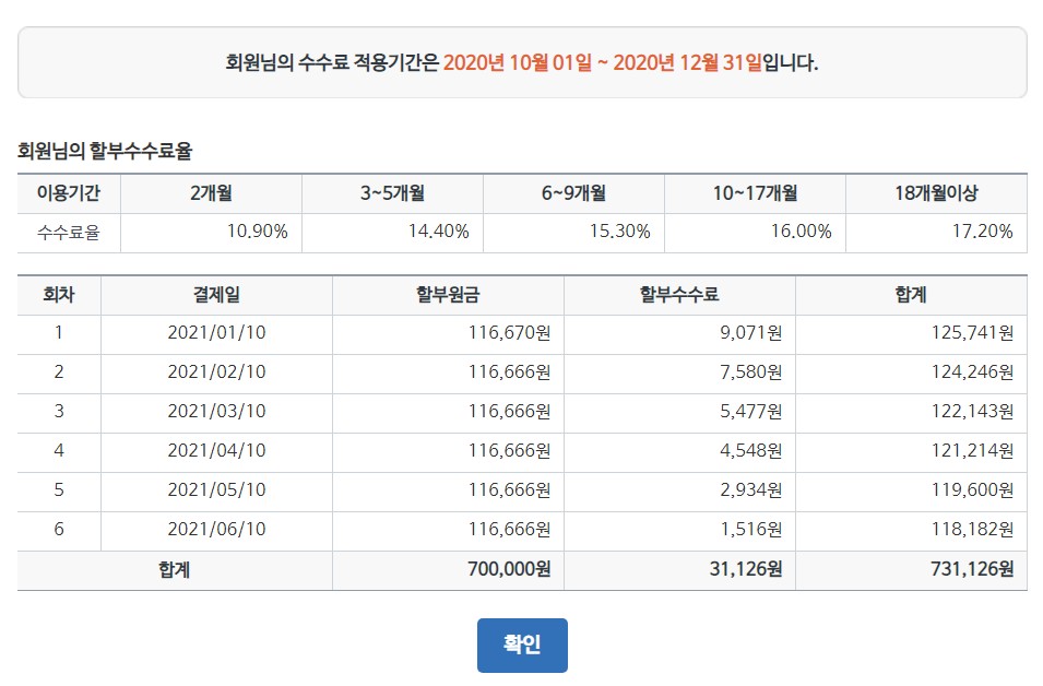 농협카드 할부 수수료율 표를 보면 6~9개월까지는 수수료율이 15.30%가 적용되는데, 카드 승인일자(사용일자)가 12월 10일 경우 2021년 1월 부터 6월까지 납부해야 할 총 할부 수수료는 31,126원이 나옵니다.