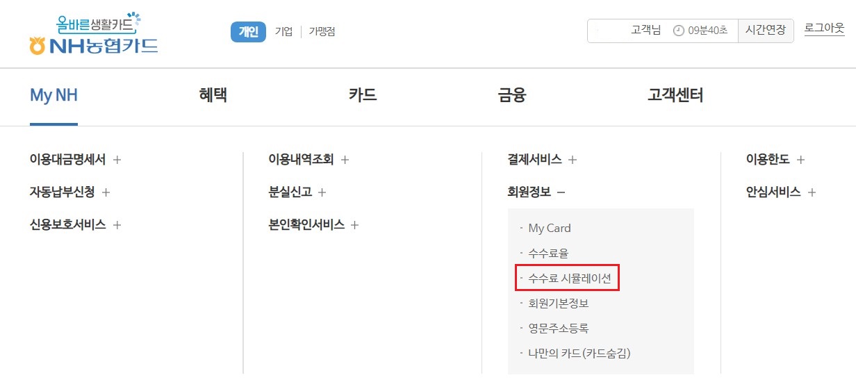 농협카드 사이트 첫 화면 상단 목록 중 My NH - 회원정보 - 수수료 시뮬레이션을 클릭합니다.