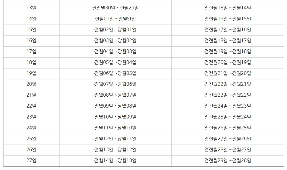 NH농협카드 결제일(청구일)은 전전월(전월)부터 전월(당월)에 이용한 대금을 당월 지불하는 시스템입니다. 당월 결제일이 언제냐에 따라 전전월(전월)부터 전월(당월) 이용기간이 정해지므로 자신의 카드 소비 스타일에 따라 결제일을 선택하시면 되겠습니다. 그럼 오늘은 농협카드 결제일별 이용기간과 결제일 변경 방법에 대해 알아보겠습니다.