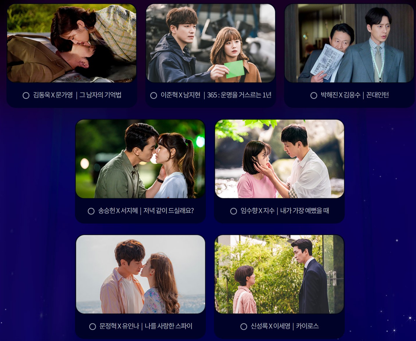 베스트 커플 후보는 그 남자의 기억법의 "김동욱&문가영", 365 : 운명을 거스르는 1년의 "이준혁&남지현", 꼰대인턴의 "박해진&김응수", 저녁 같이 드실래요?의 "송승헌&이지혜", 내가 가장 예뻤을 때의 "임수향&지수", 나를 사랑한 스파이의 "문정혁&유인나", 카이로스의 "신성록&이세영"이었는데, 어떤 커플이 네티즌들의 사랑을 가장 많이 받았을지 궁금하네요.