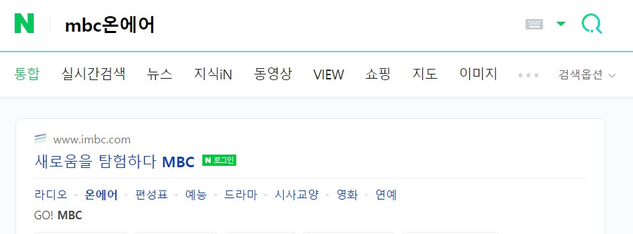 포털 사이트 검색창에서 "mbc온에어"를 입력 후 MBC 사이트 바로가기 아래 항목 중 "온에어"를 클릭합니다.