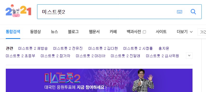 3. 상단에 검색 결과가 나오면 "미스트롯2" 배너를 클릭합니다.