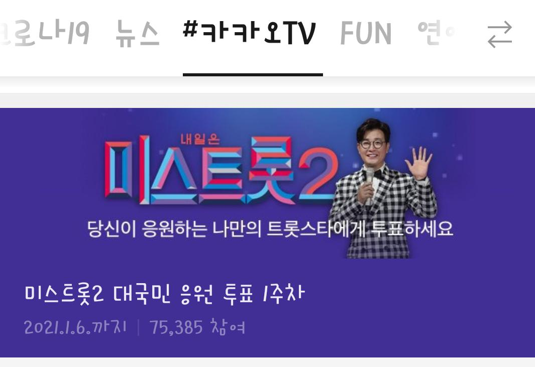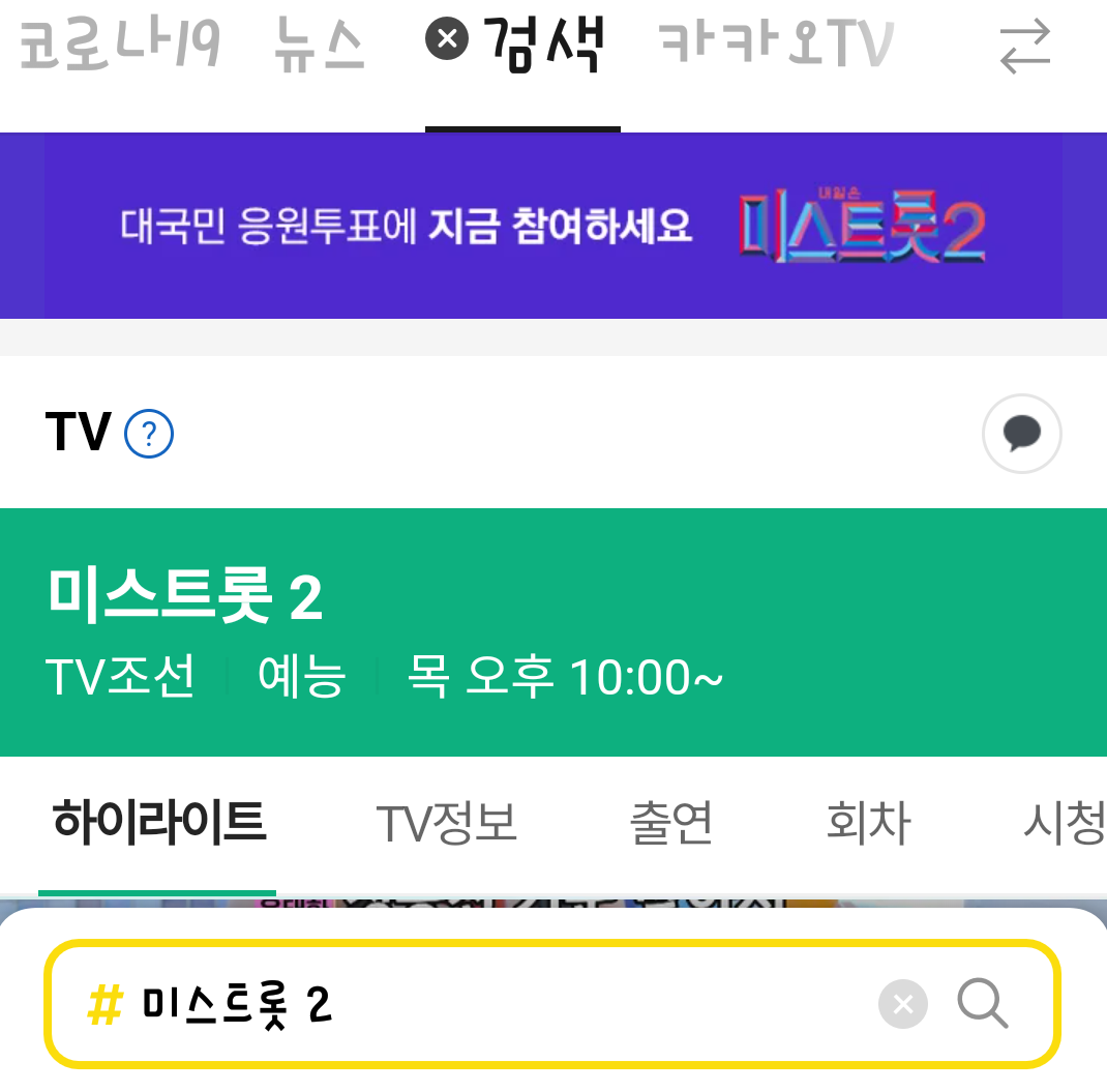 검색창에서 "미스트롯2"를 검색하신 뒤 "미스트롯2" 배너를 클릭하면, 응원 투표 페이지로 이동합니다.