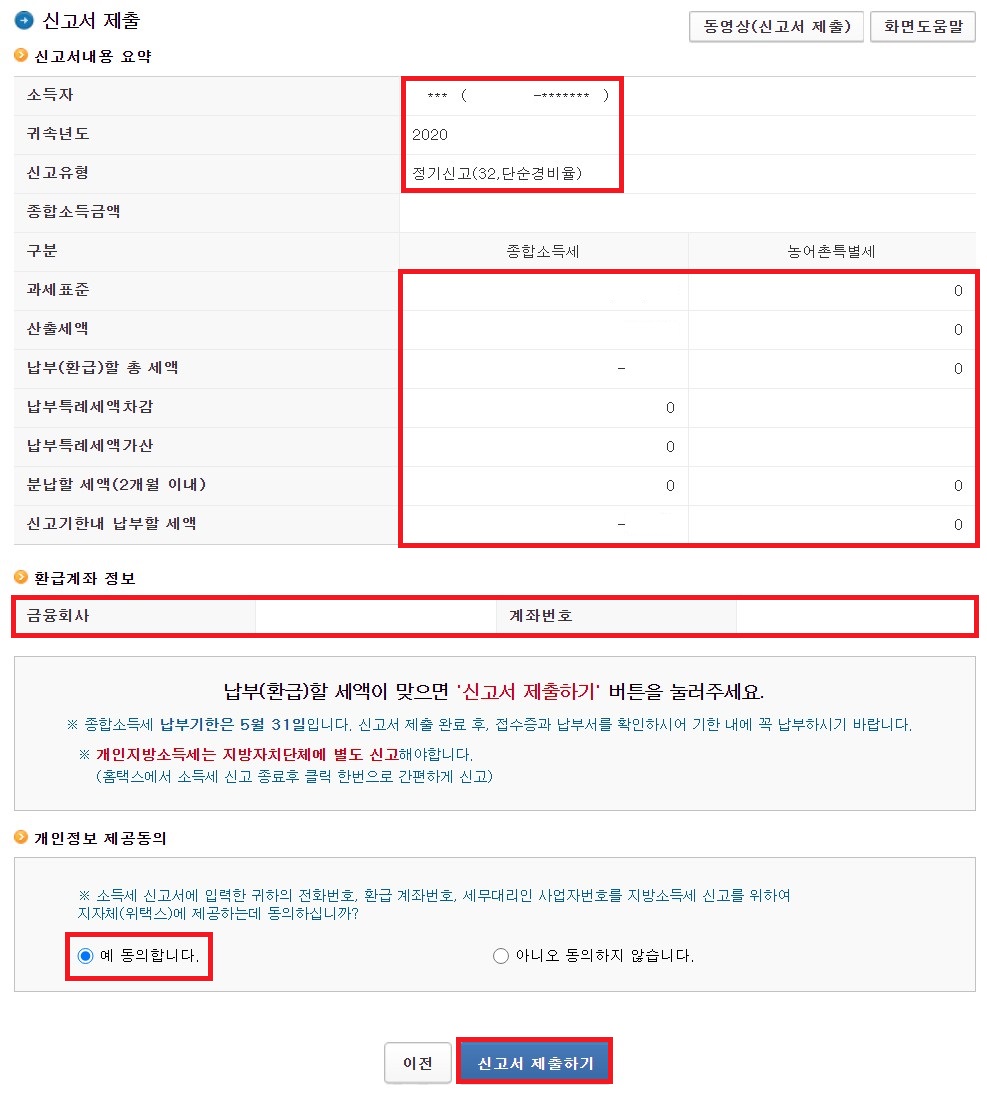 17. 마지막은 신고서 제출 단계로 최종 산출세액을 확인 후 환급금이 있으면 은행명과 계좌번호를 입력 후 개인정보 제공동의에 체크한 다음 신고서를 제출합니다.