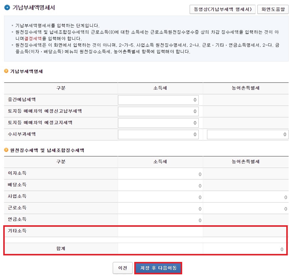 16. 기납부세액은 이전에 낸 세금으로 저는 기타소득에 대한 원천징수금이 있었습니다. 확인 후 다음으로 넘어갑니다.