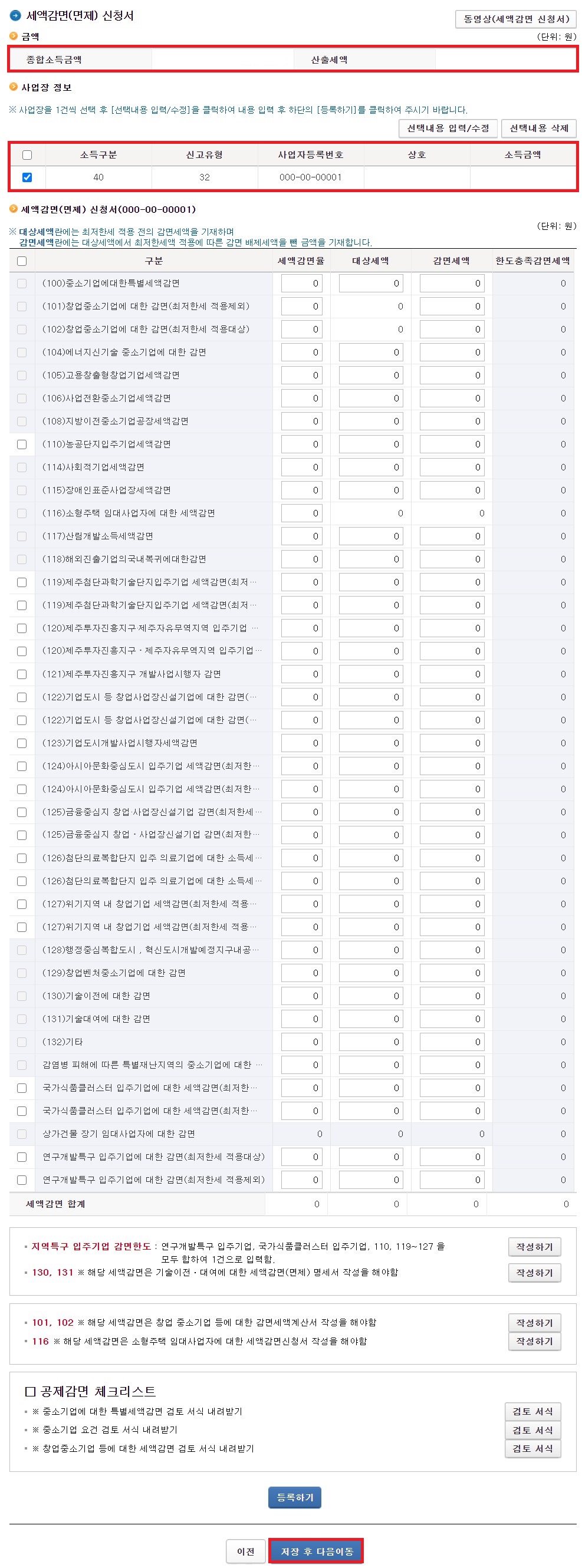 13. 세액감면(면제) 신청서 단계입니다. 감면 신청할 항목이 있으면 입력하시고, 없으면 상단의 총소득금액과 산출세액만 확인 후 다음으로 넘어갑니다. 위와 똑같은? 페이지가 한 번 더 나왔던 것 같은데, 마찬가지로 해당 사항이 있으면 입력하고 없으면 넘어갑니다.