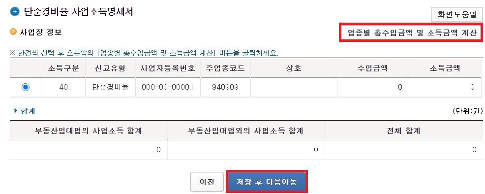 7. 그럼 위와 같은 계산 창이 열립니다. 총수입금액을 입력 후 '등록하기' 버튼을 클릭, 아래 '총수입금액 및 소득금액 명세(업종별)' 항목을 체크 후 '입력완료' 버튼을 클릭합니다. 이어서 이전 화면으로 돌아와 '저장 후 다음이동' 버튼을 클릭합니다.
