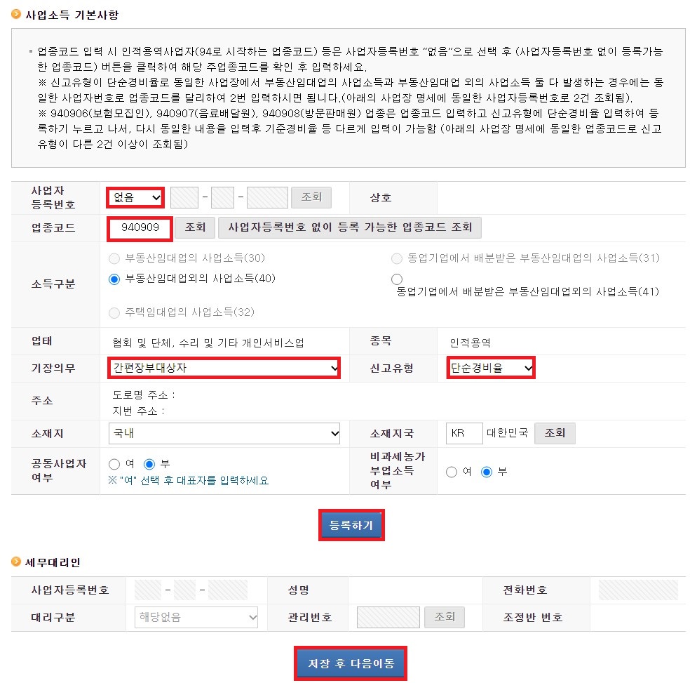 5. 사업자등록번호와 업종코드 입력 후 '조회' 버튼을 클릭합니다. 저는 사업자등록을 하지 않았으므로 사업자등록번호는 '없음'으로 하고, 애드센스 수익에 해당하는 업종코드가 아직 없어서 많이들 대체 코드로 이용하는 '940909(기타자영업)'를 입력해 주었습니다. 다음으로 기장의무를 '간편장부대상자', 신고유형을 '단순경비율'로 설정한 다음 '등록하기' → '저장 후 다음이동' 버튼을 차례로 클릭합니다.