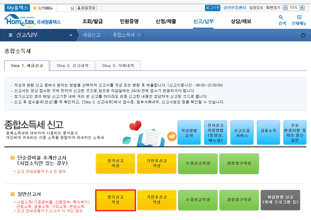 3. 종합소득세 신고 항목들 중 '일반신고' → '정기신고 작성'으로 들어갑니다.