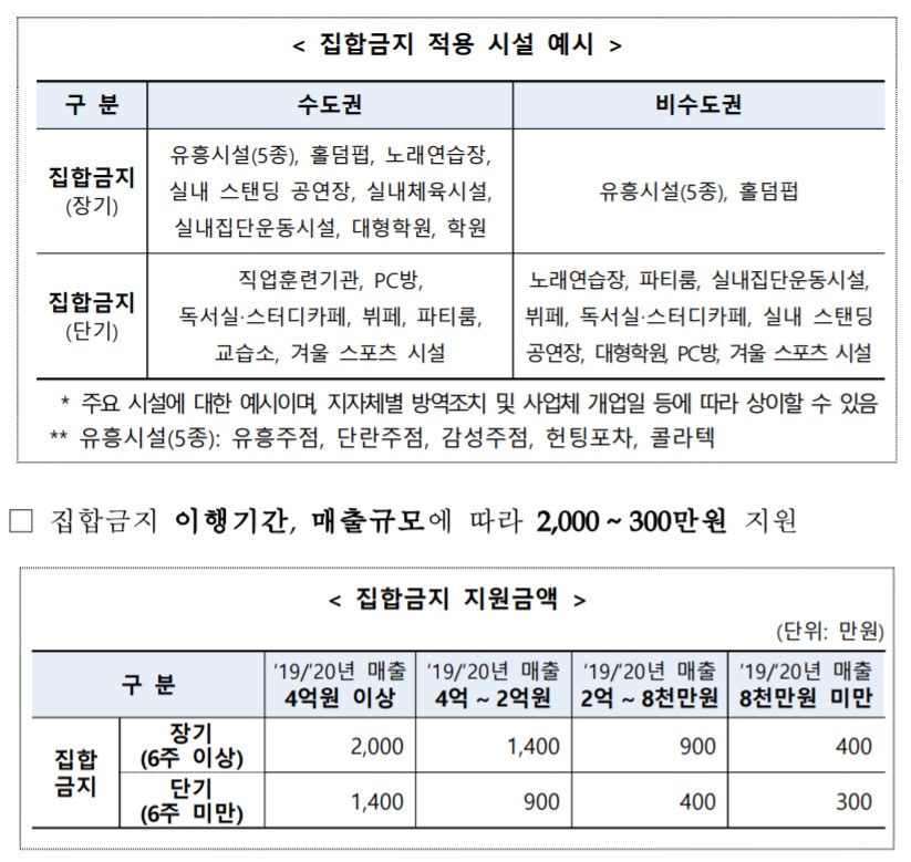 집합금지 업종은 집합금지 이행기간이 장기(6주 이상)인지 단기(6주 미만)인지, 또 수도권이냐 비수도권이냐에 따라서 적용되는 시설이 다르므로 위 이미지를 참고하시어 지원금액을 가늠해보시기 바랍니다.