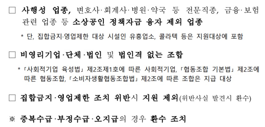 - 사행성 업종, 변호사‧회계사‧병원‧약국 등 전문직종, 금융‧보험 관련 업종 등 소상공인 정책자금 융자 제외 업종