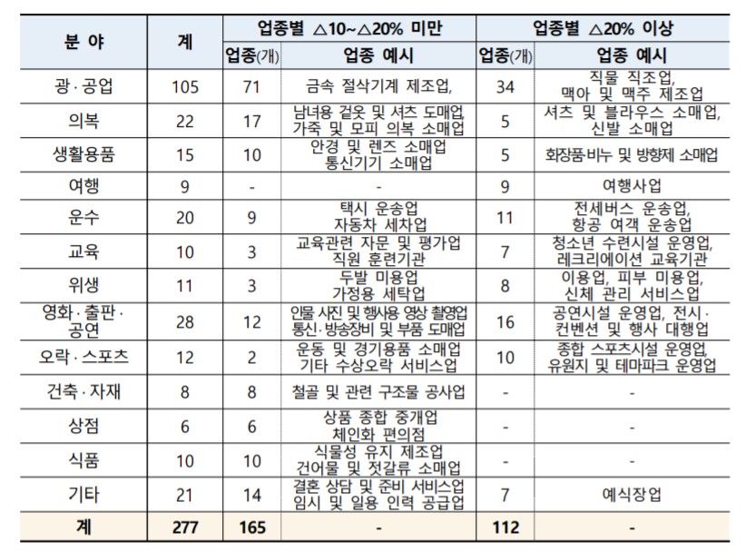 경영위기 업종 대상은 매출감소율이 10% 이상이며, 매출액이 감소한 소기업으로, 국세청 부가세 신고 매출액이 19년 대비 20년에 10%이상 감소한 13개 분야 총 277개 업종이 이에 해당됩니다. 해당 업종은 위 표를 참고하시기 바랍니다.
