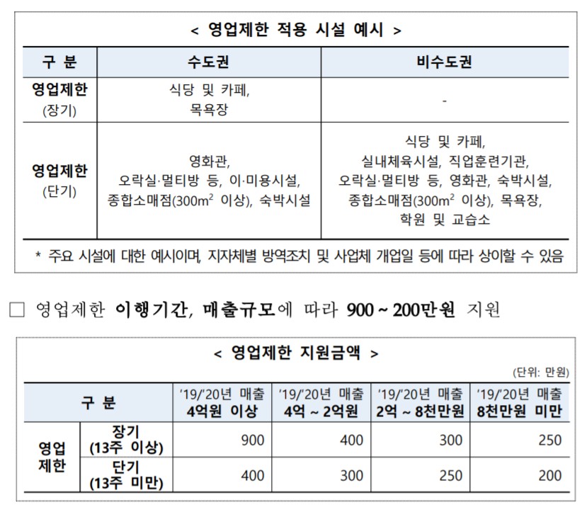 영업제한 업종 또한 장기(13주 이상)냐 단기(13주 미만)냐, 수도권이냐 비수도권이냐에 따라 적용되는 시설이 달라지며, 영업제한 이행기간과 매출규모에 따라 최소 200만원에서 최대 900만원까지 받으실 수 있습니다.